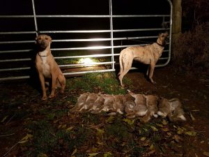 The lamp light up a rabbit that was squatting very tight, his ears folded tight over his head and he wriggled tighter into the grass as the light moved in the wind. I gave the slip lead to David and whispered to him not to release the dog until the rabbit run and the dog could see it. James and I stood still and as I held the beam on the rabbit David approached carefully on the outside. Closer and closer they got, the dog on the end of the slip lead had no clue what was going on at all, this was his first lamping foray, his first venture into the world of twilight pursuits. David whispered to him all the way up, encouraging him and letting him know something was on. The rabbit seemed to go almost totally flat as I held the light on him. By now both David & Reggie were almost on top of the rabbit and for what seemed like minutes he sat tight and they looked on , edging and edging ever closer until just as they got right on top of him he sprang right up out of the grass. Reggie reared up on his back legs and as the rabbit made some distance the slip lead cracked as it slid through his collar and caught itself on the end. For me the whole thing went in slow motion – The rabbit came straight towards James and I, David’s voice could be heard 100yards away in the black dark cheering Reggie on! The rabbit passed us, turned and came back while Reggie turned like a boat on the wet grass. He attempted a strike as they passed once more and I heard his teeth snap like a crocodile, before he put in a second strike and almost lost his footing before trying for a third which didn’t connect but he certainly got a mouthful of fur! We were all holding our breath. The rabbit turned again and jinked against a fence and back out into the field and with one final attempt young Reggie scooped the rabbit up almost right at my feet. I breathed a sigh of relief and my two comrades cheered.